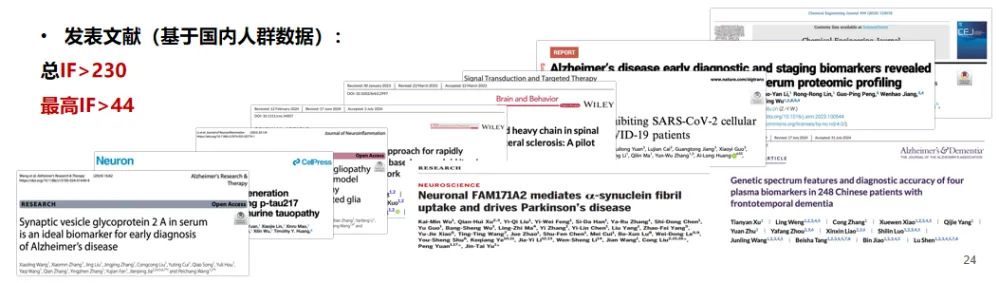 同時,宇測生物樹立國內(nèi)AD血液生物標(biāo)志物學(xué)術(shù)影響旗幟,不斷推進以神經(jīng)科學(xué)為核心的新型生物標(biāo)志物的臨床轉(zhuǎn)化與市場推廣,與國內(nèi)多家頭部醫(yī)院形成深度合作,發(fā)表多篇高影響力學(xué)術(shù)論文。目前在高端科研和頭部臨床單位已完成兩萬多例血液樣本研究,參與多項國內(nèi)大型隊列研究,平臺累計發(fā)表IF>230,為神經(jīng)科學(xué)超敏血液生物標(biāo)志物的疾病的研究提供最強助力。