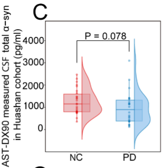 在本研究中,Dx-90平臺為揭示PD病理機(jī)制提供了重要支持?;趩畏肿用庖邫z測技術(shù)檢測腦脊液(CSF)中的總α-syn水平變化:結(jié)果顯示PD患者CSF中總α-syn水平降低,這可能反映了腦內(nèi)α-syn聚集的增加。