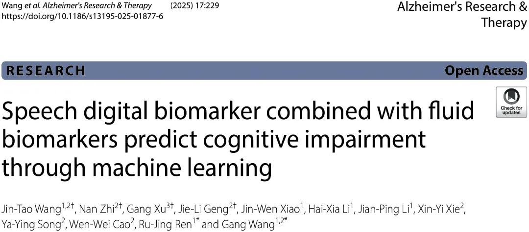 由王剛教授團(tuán)隊在《Alzheimers Research & Therapy》(IF=7.6)上發(fā)表語音數(shù)字生物標(biāo)志物與血液生物標(biāo)志物預(yù)測認(rèn)知損傷與大腦病理變化的研究,并成功構(gòu)建了高效、低成本的機器學(xué)習(xí)診斷模型。