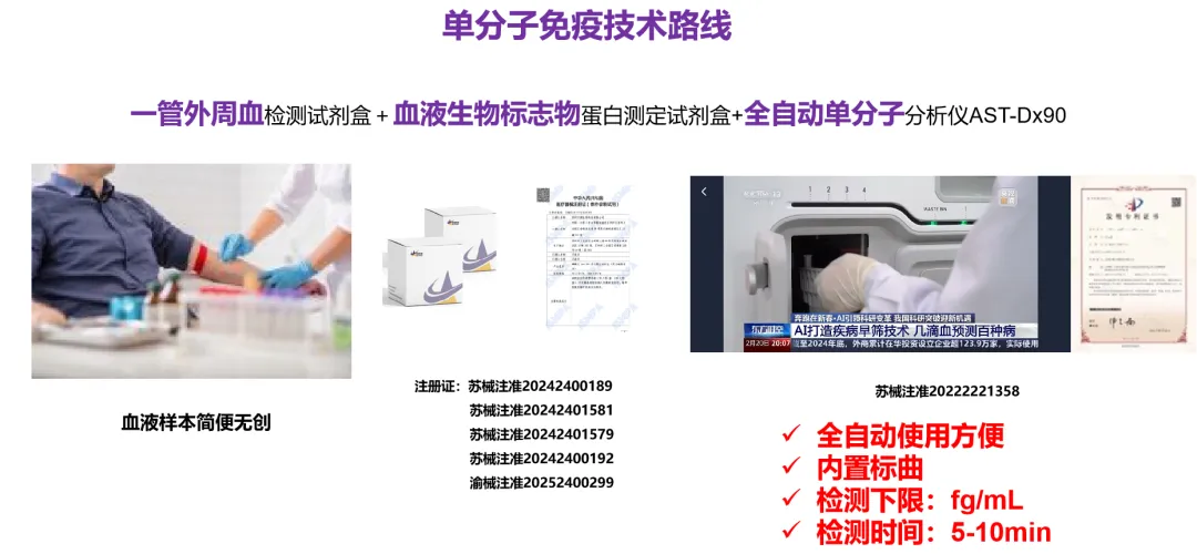 目前,宇測生物基于完全自主知識產(chǎn)權(quán)的領(lǐng)先單分子免疫檢測技術(shù),檢測靈敏度可達 fg/mL 量級,能夠準(zhǔn)確檢測出血液中濃度極低的p-tau生物標(biāo)志物的微量變化,全自動操作流程,10分鐘即可獲得實驗結(jié)果,降低臨床檢測對人力和物力的消耗,實現(xiàn)快速精準(zhǔn)的AD檢測。